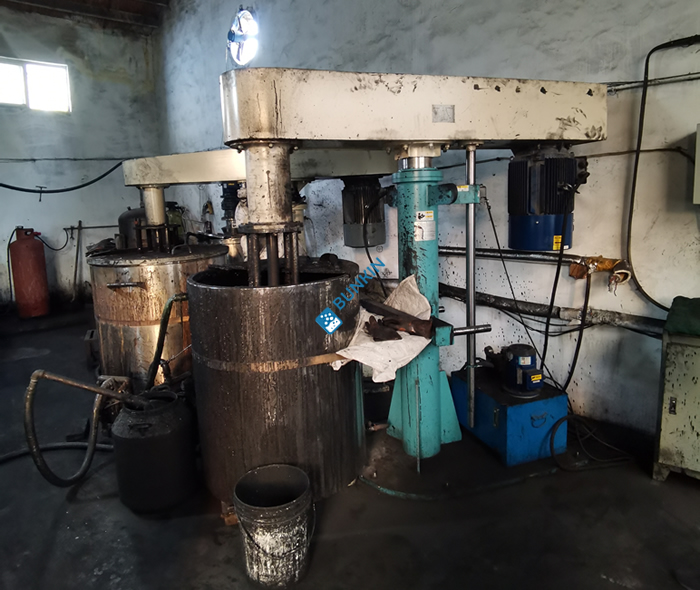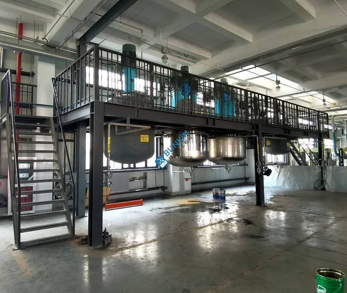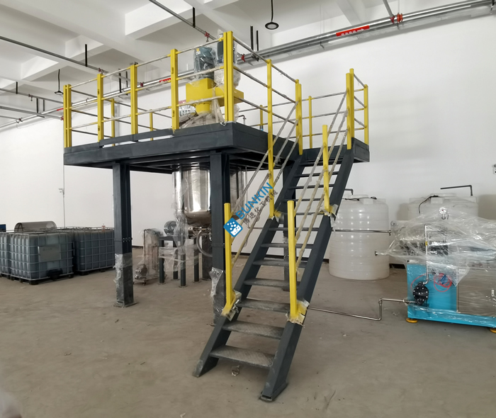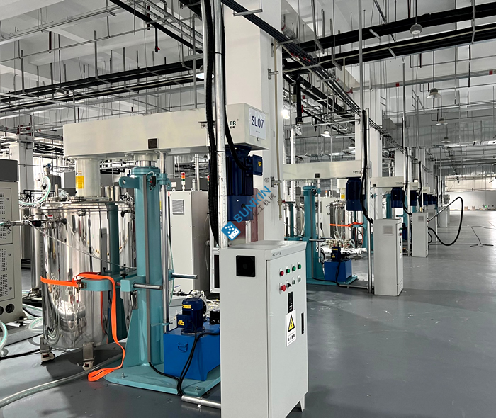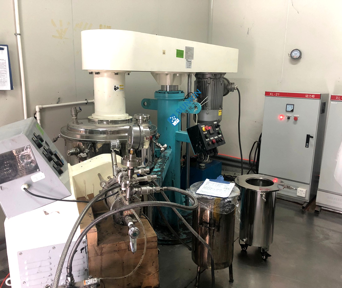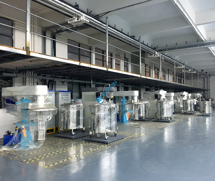 浙江XX電子材料有限公司購買液壓升降籃式研磨機、電動升降分散攪拌機等使用現場。