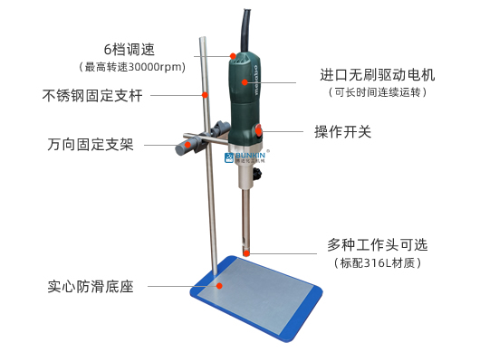 設備帶有鎖緊及升降手柄,能夠快速升降和固定;均質頭快拆式設計,更換方便,清洗容易。