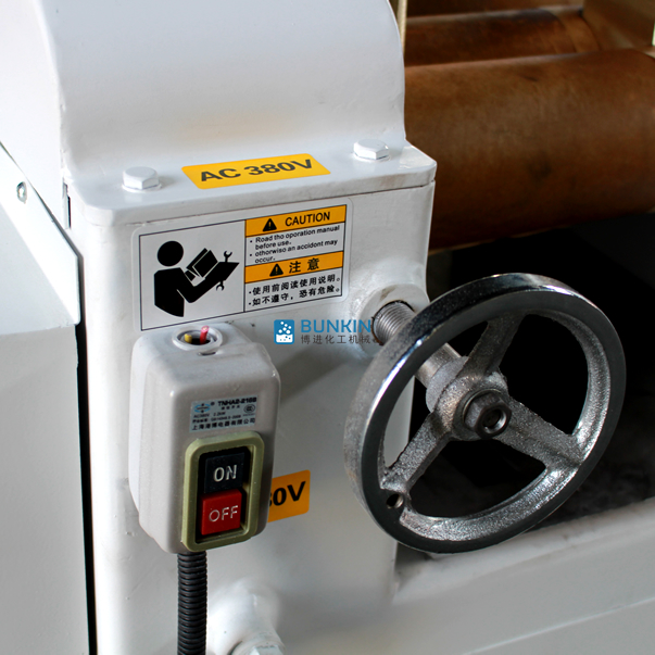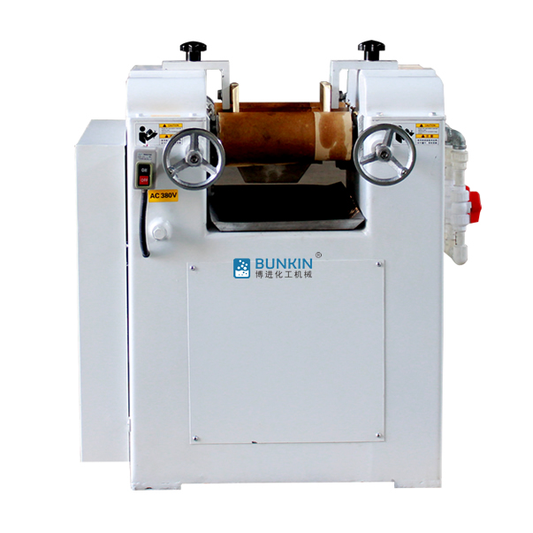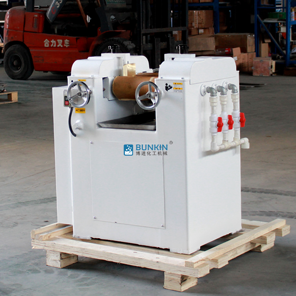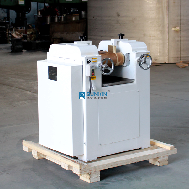三輥研磨機由三個輥筒組成,裝在一個機架上,由電動機直接帶動。一般輥筒間的轉動方向不同,前輥向前轉動,中輥向后轉動。輥子轉速前輥快、后輥慢。中間輥固定,前后兩輥裝在滑道上,有彈簧裝置,用手輪調節前后輥與中輥的距離。物料由后輥與中輥之間進入,受到輥筒的擠壓,產品顆粒變細,然后由快輥帶出,快輥末端裝有刮刀,使物料與輥筒分離,落入收集桶內。
