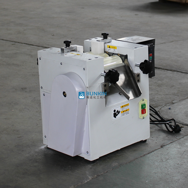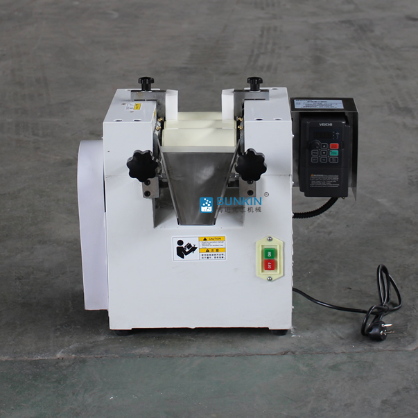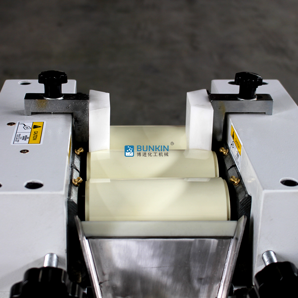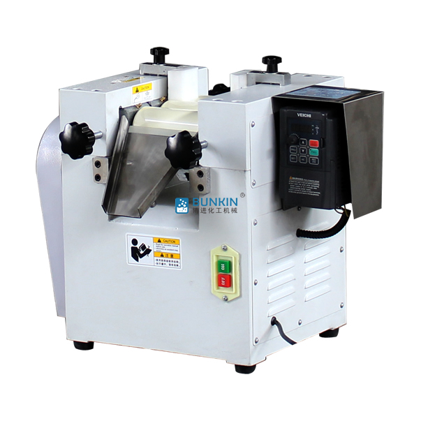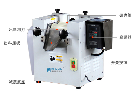 實驗室三輥研磨機由三個輥筒組成,裝在一個機架上,由電動機直接帶動。一般輥筒間的轉動方向不同,前輥向前轉動,中輥向后轉動。輥子轉速前輥快、后輥慢。中間輥固定,前后兩輥裝在滑道上,有彈簧裝置,用手輪調節前后輥與中輥的距離。物料由后輥與中輥之間進入,受到輥筒的擠壓,產品顆粒變細,然后由快輥帶出,快輥末端裝有刮刀,使物料與輥筒分離,落入收集桶內。