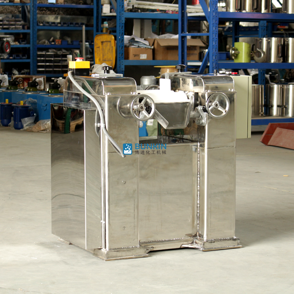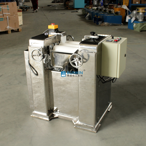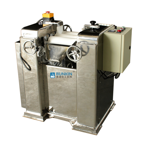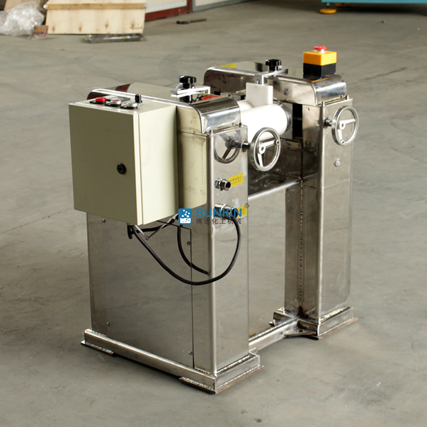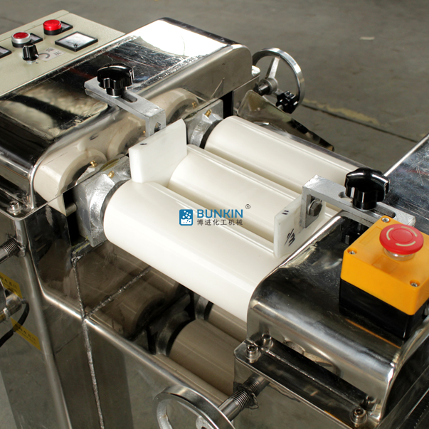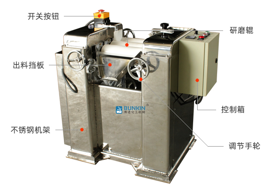 三輥研磨機由三個輥筒組成,裝在一個機架上,由電動機直接帶動。一般輥筒間的轉動方向不同,前輥向前轉動,中輥向后轉動。輥子轉速前輥快、后輥慢。中間輥固定,前后兩輥裝在滑道上,有彈簧裝置,用手輪調節前后輥與中輥的距離。物料由后輥與中輥之間進入,受到輥筒的擠壓,產品顆粒變細,然后由快輥帶出,快輥末端裝有刮刀,使物料與輥筒分離,落入收集桶內。
