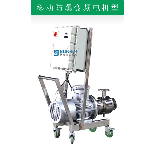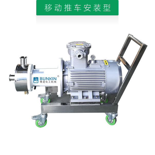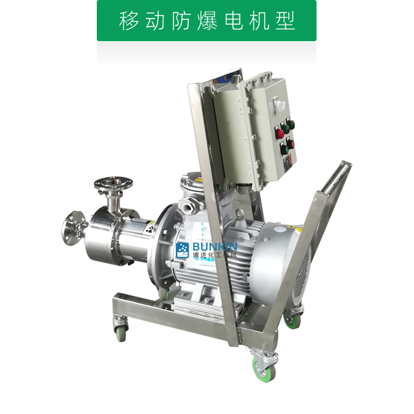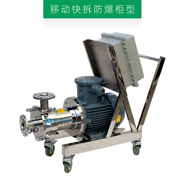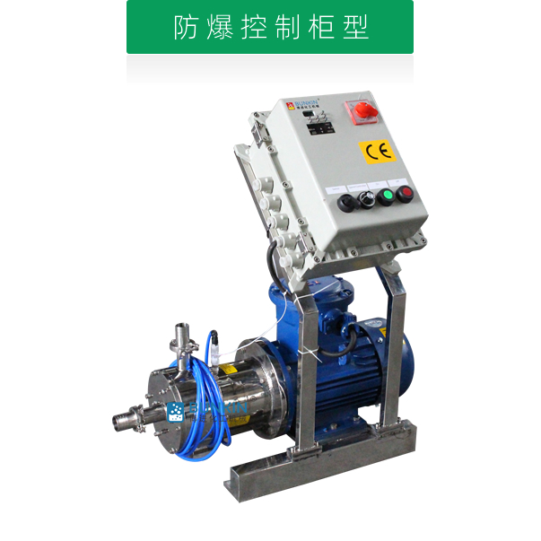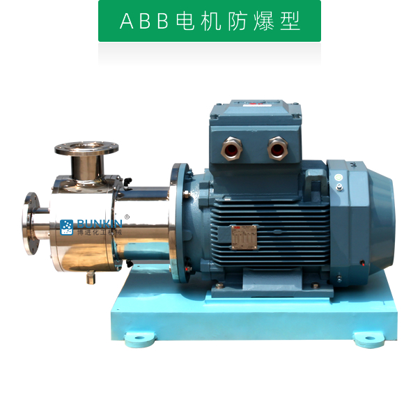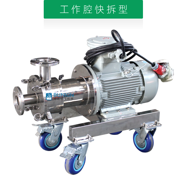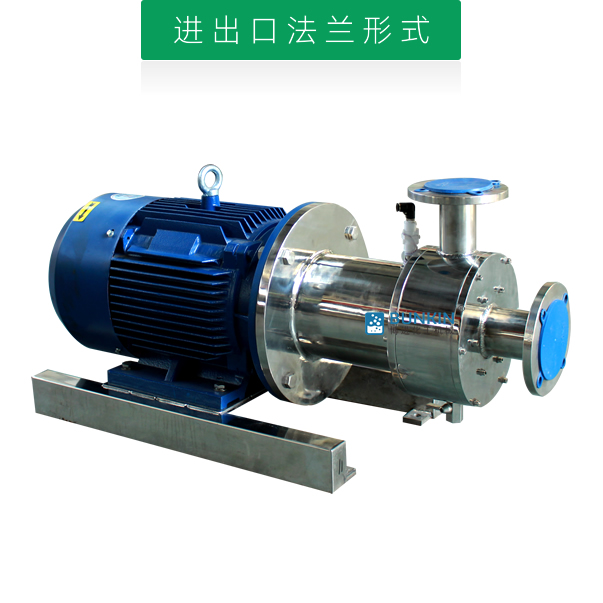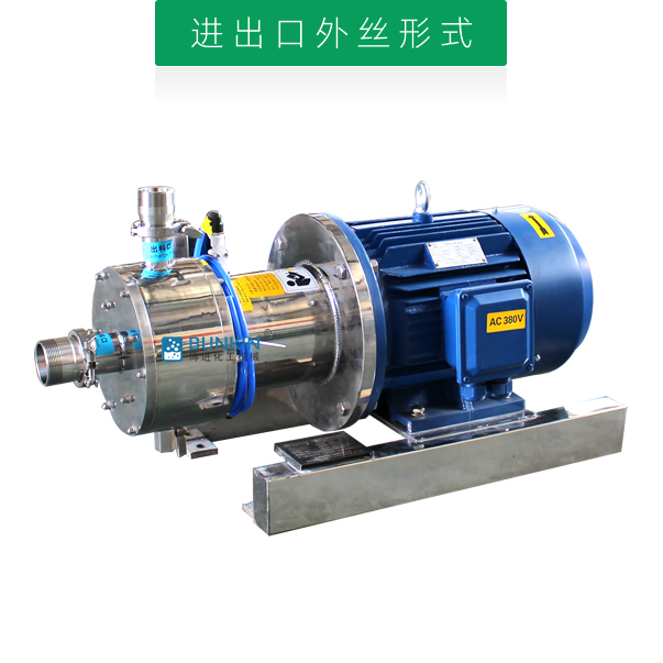 單級乳化泵采用臥式結構。在狹長的工作腔內裝有一組轉定子,轉定子可設計成單級兩層或者單級六層結構,轉定子對偶耦合。由電機帶動中間軸進行高速運轉,轉定子形成真空,物料從進口被吸入轉定子腔內,強大動能使轉子產生極高的線速度,使物料在轉、定子間隙之間經過強烈的撞擊、破碎、離心擠、液層摩擦、強力剪切之后飛射出去,在多種不同方向力的作用下,產生強大紊流,物料從出口流出。并可根據工藝要求進行多次循環處理。