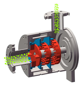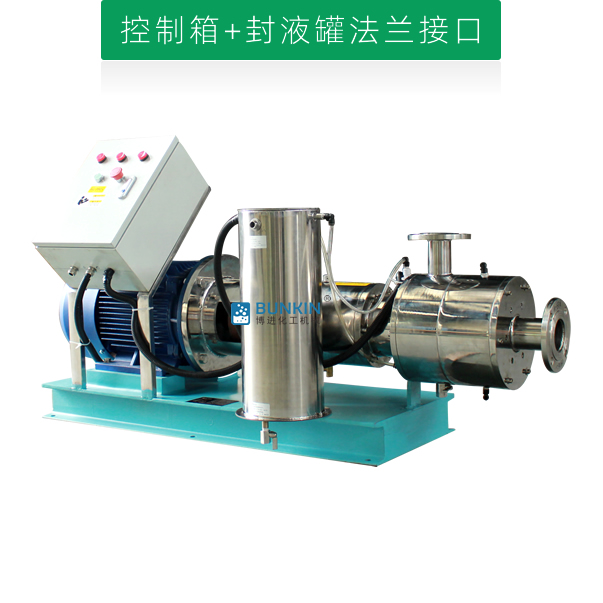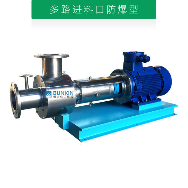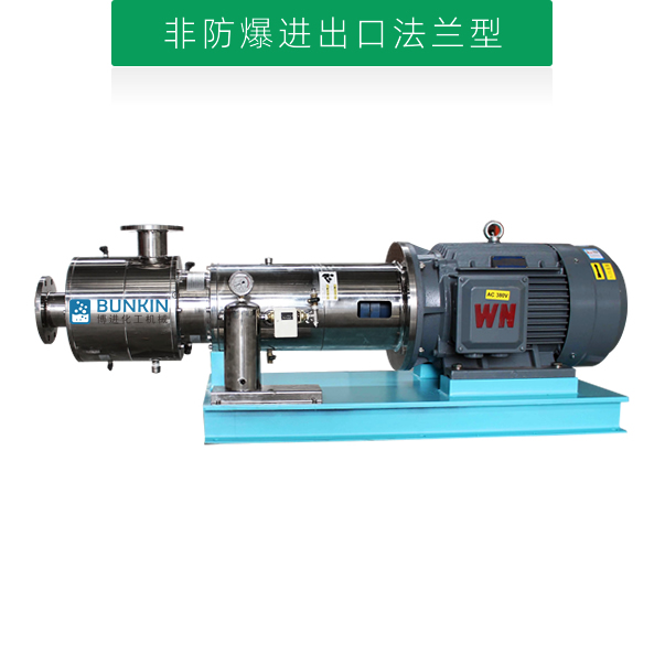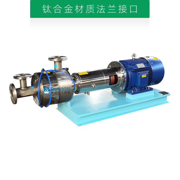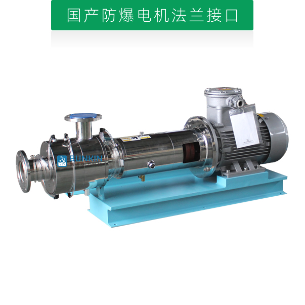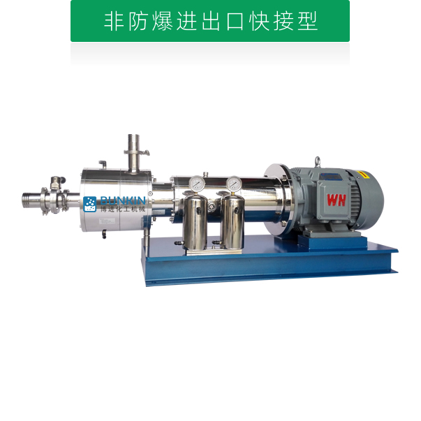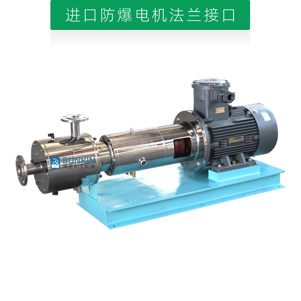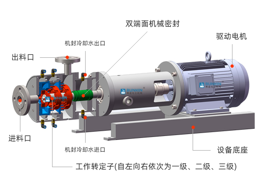管線式三級乳化泵采用臥式結構。在狹長的工作腔內裝有三組轉定子,轉定子可設計成三級十二層、三級十四層、三級十八層或者其它非標結構形式,轉定子對偶耦合,高度配合。由電機帶動中間軸進行高速運轉,轉定子形成真空,物料從進口被吸入轉定子腔內,強大動能使轉子產生極高的線速度,使物料在轉、定子間隙之間經過強烈的撞擊、破碎、離心擠、液層摩擦、強力剪切之后飛射出去,在多種不同方向力的作用下,產生強大紊流,物料從出口流出。
