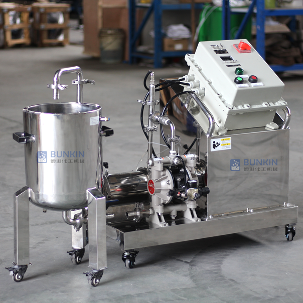 實驗室中試臥式砂磨機的隔膜泵將喂料斗內的物料與研磨腔形成循環研磨。研磨腔內填充研磨介質受到撥盤旋轉帶動產生各個方向的力并不規則運動,物料中的顆粒受到研磨介質不斷的碰撞及摩擦,同時,篩網使物料和研磨介質分開,物料不斷的從料斗罐到研磨腔循環流動,實現粒徑變小,粒徑范圍變窄的目的。
