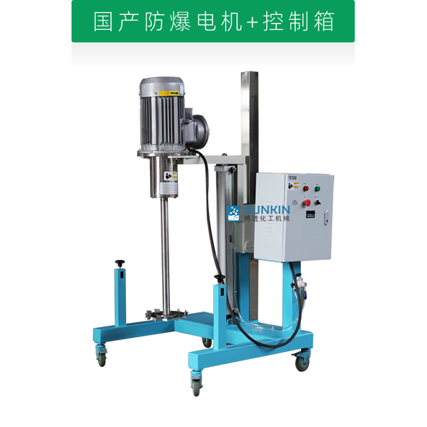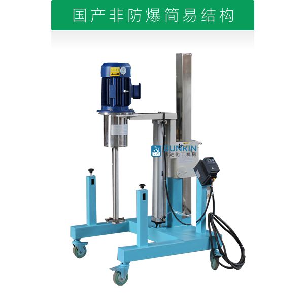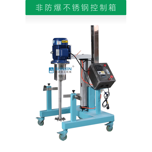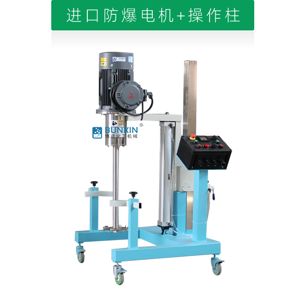 設備通過氣缸作為升降執行器,帶氣動控制閥控制分散機上升、停止、下降,耗氣量低,操作簡單;分散盤采用內六角螺栓與主軸固定,能夠方便快速拆卸更換,清洗容易;帶有手動夾桶裝置,可以快速將攪拌桶固定,防止桶在工作中發生位移造成安全事故;