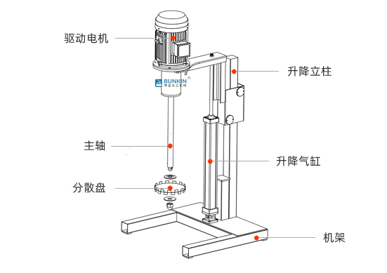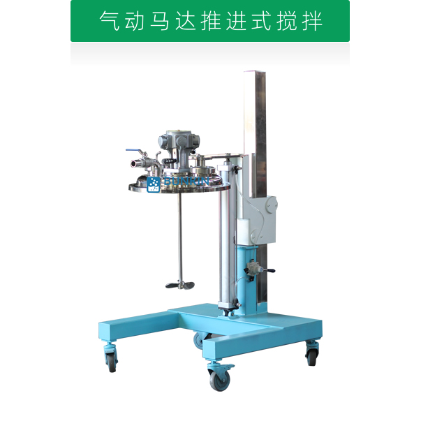氣動升降分散機通過分散盤的高速運轉,使物料呈環狀流,產生強旋渦,呈螺旋狀下降到渦流底部。粒子間產生強烈的剪切撞擊與磨擦,達到迅速分散、溶解、均勻混合的功能。通過氣閥旋轉或電磁閥點動控制實現氣缸工作,利用氣缸升降帶動電機及工作頭升降。