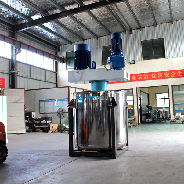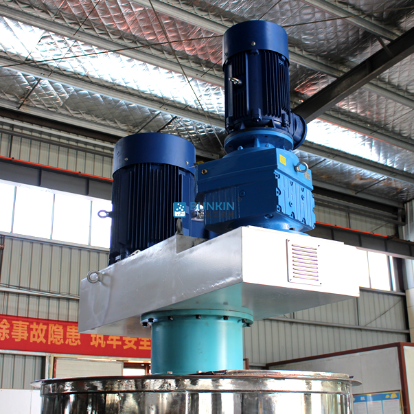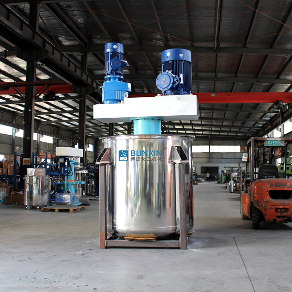 同心雙軸分散攪拌釜攪拌漿葉在動力機組的驅動下,沿固定方向旋轉;在旋轉過程中,驅使物料做軸向旋轉和徑向旋轉。攪拌機內的物料,同時存在軸向運動和圓周運動,因而同時存在剪切攪拌和擴散攪拌等幾種攪拌形式。在攪拌槳上裝有刮刀,緊貼桶壁刮拭,刮刀隨著攪拌器旋轉時把桶壁的物料完全刮掉,使桶壁無滯留料,同時提高混合效果。分散盤通過高速運轉,使物料呈環狀流,產生強旋渦,呈螺旋狀下降到渦流底部。粒子間產生強烈的剪切撞擊與磨擦,達到迅速分散、溶解功能。攪拌盤通過圓周運動,產生較好的徑向作用里,加速物料循環,提高分散效率。