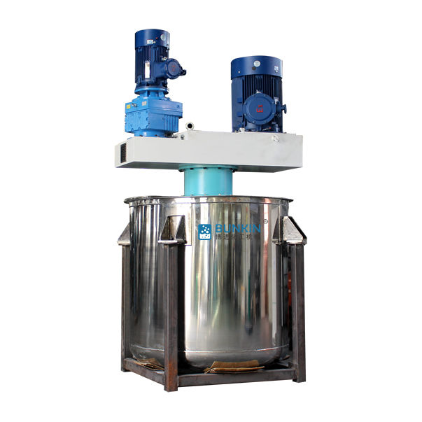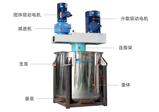同心雙軸分散攪拌釜由帶刮壁式攪拌器和高速分散器組成,兩組攪拌器同時作業使物料受到強烈的分散、混合作用,達到快速混合的目的;攪拌器一般分為錨式和蝶式兩種,針對不同粘度、比重的物料和不同的生產工藝要求可以設計較好攪拌形式。