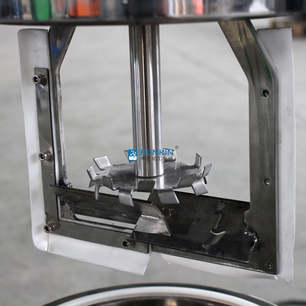 在攪拌器上裝有刮刀,緊貼桶壁刮拭,桶壁經立車精加工后,再經自動拋光機拋光,確保活動刮刀在旋轉時把桶壁的物料完全刮掉,使桶壁無滯留料,提高混合效果。