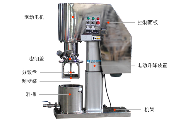 雙軸多功能強力分散攪拌機由帶刮壁式攪拌器和高速分散器組成,兩組攪拌器同時作業使物料受到強烈的剪切、混合作用,達到快速混合的目的;攪拌器一般分為錨式和蝶式兩種,針對不同粘度、比重的物料和不同的生產工藝要求可以設計較好攪拌形式。